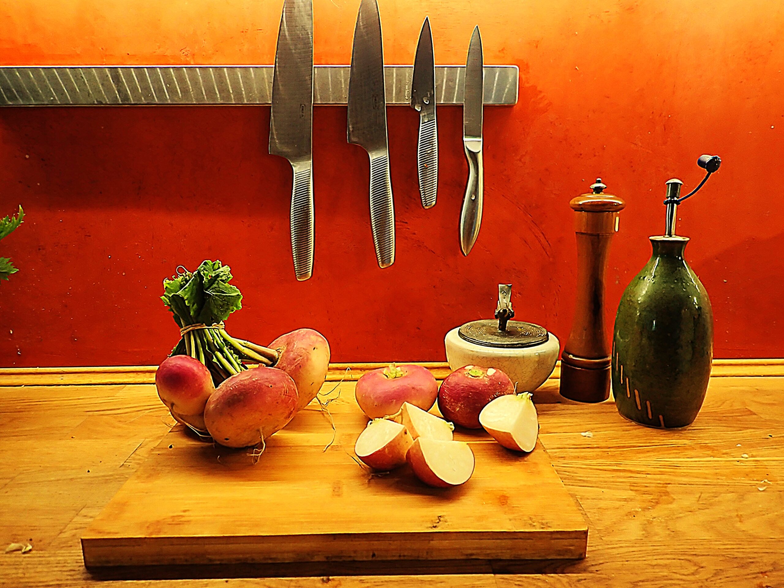 Botte de navets « Milan à collet rose ». Suggestion de recette de navets braisés: couper les navets en tronçons de 2cm: les faire cuire dans l’eau bouillante jusqu’à ce que la pointe du couteau y pénètre facilement. Égoutter puis faire revenir à feu assez vif dans de l’huile à la poêle en ajoutant du sucre en poudre (ou miel ou sirop d’érable) pour les caraméliser légèrement sur toutes les faces. Une fois dorés, réserver les navets en conservant le surplus d’huile dans la poêle. Couper le feu sous la poêle et ajouter 20cl de crème de soja (ou crème fraiche), un peu de fenugrec en poudre, un peu de sauce soja et un peu de poivre, remuer puis verser cette sauce dans un ramequin. Déguster les navets en les trempant dans la sauce. Une autre variante consiste à déglacer les navets avec un jus d’orange pressé mélangé à de la sauce soja, du sirop d’érable (ou miel), du ras el hanout et un peu d’eau. Laisser cuire jusqu’à ce que le liquide s’évapore presque entièrement et que les navets caramélisent un peu. Servir avec un riz blanc. Bon appétit!