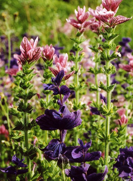 Cette espèce de sauge vous enchantera par l’originalité de son spectacle : ce ne sont pas seulement ses petites fleurs, mais surtout ses bractées (feuilles colorées au sommet des tiges) aux violets et roses intenses qui captivent le regard. La Sauge hormine offre une floraison infatigable qui persiste courageusement, même après de légères gelées automnales. Très mellifère, elle transforme le jardin en un véritable garde-manger pour les pollinisateurs tout au long de la saison.