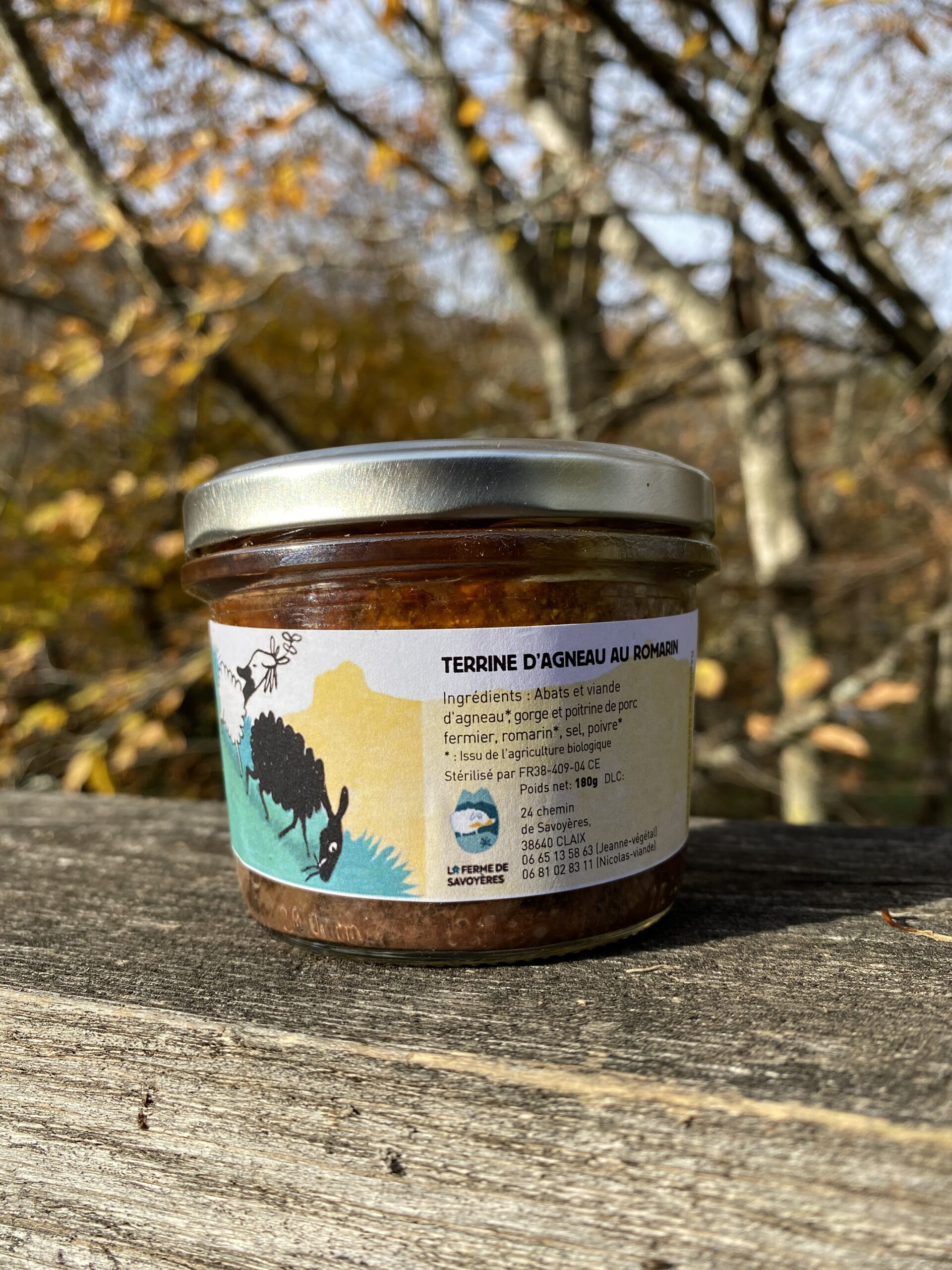 Ingrédient: Viande d’agneau de la ferme dont abats, gorge et poitrine de porc plein air de la ferme du Clos Perrier (Saint pierre de chartreuse), romarin, sel et poivre.