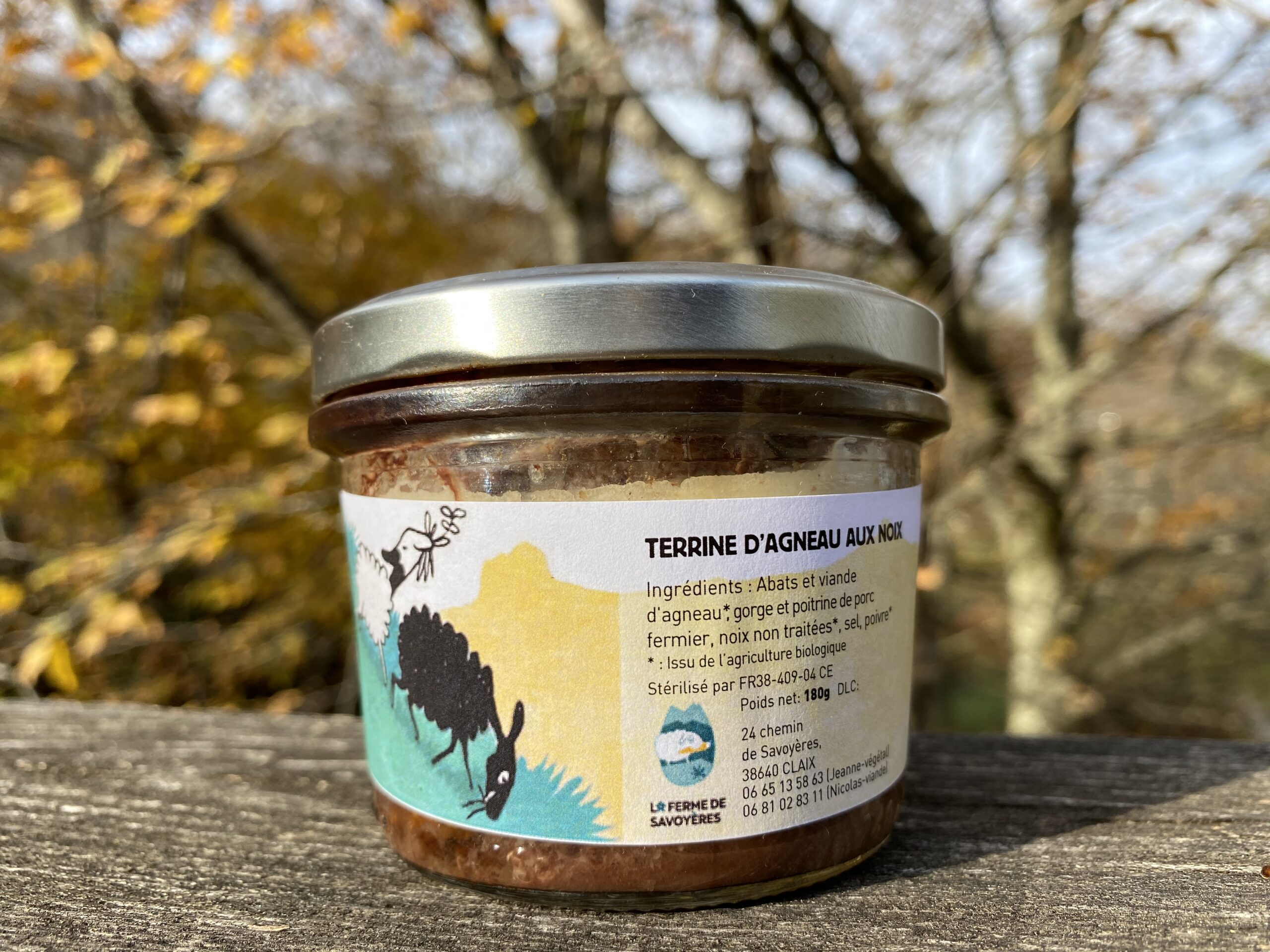 Ingrédient: Viande d’agneau de la ferme dont abats, gorge et poitrine de porc plein air de la ferme du Clos Perrier (Saint pierre de chartreuse), noix de notre verger, sel et poivre.